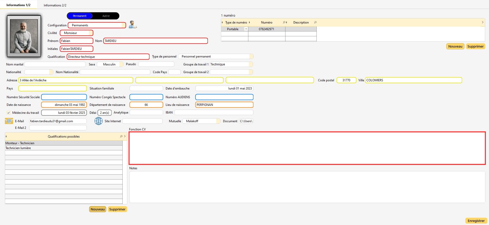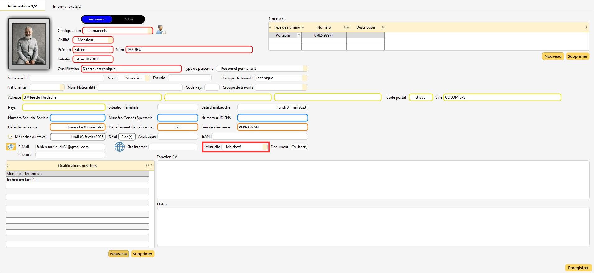 L'onglet "Informations 1/2" de la fiche Personnel est agencé pour que les rubriques indispensables d'un salarié soient mises en valeur.