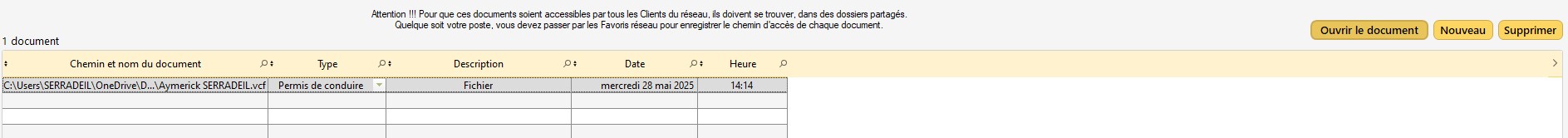 La fenêtre des documents de la personne s'ouvre pour pouvoir les gérer (Ouvrir/Nouveau document/Supprimer).
