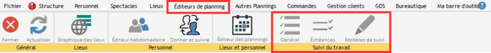Dans la nouvelle barre d'outils, cliquez sur l'onglet "Editeurs de planning" et utilisez les outils de la rubrique "Suivi du travail".