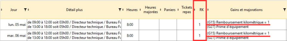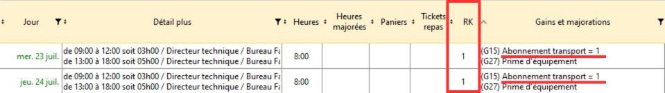 Info : la colonne "RK" pour "Remboursement kilométrique" apparaît.