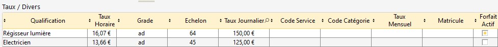 Dès que la personne ci-dessus sera planifiée sur des services en tant que Régisseur Lumière, elle sera au forfait journalier sur ces services ; les autres services avec d'autres qualifications seront au taux horaire.