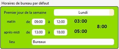 Ces valeurs seront utilisées pour la création rapide d'heures de bureau, les arrêts maladies ou les horaires de bureau dans la validation des heures. Cela permet aussi de paramétrer des temps partiels ou autres.