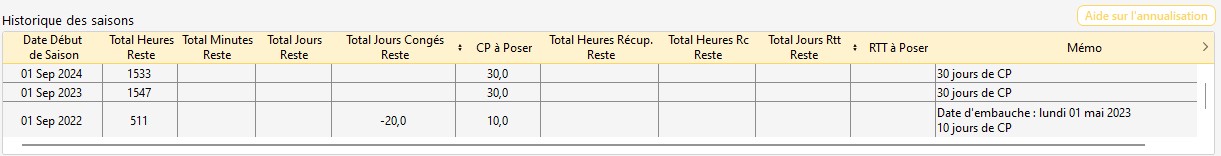 - "Total Heures Reste" permet de saisir le nombre d'heure de travail restant au début de l'annualisation de la personne..