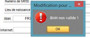 RS contient un algorithme qui vérifie l'authenticité du numéro IBAN. S'il y a une erreur dans le numéro, une fenêtre signalera cette inexactitude et le numéro ne pourra pas être enregistré.