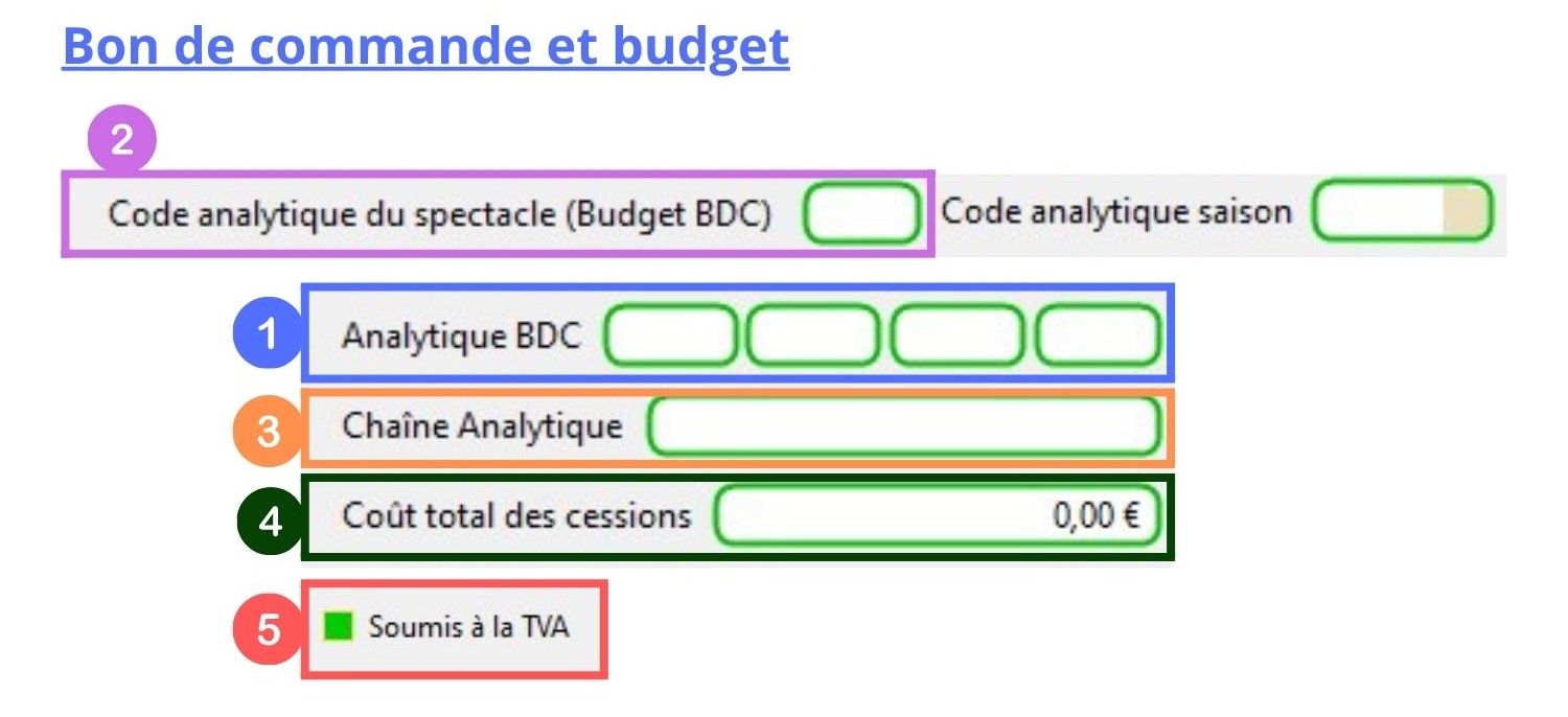 En parallèle au champ "Analytique BDC 1" et "Code analytique du spectacle (Budget et BDC)", il est possible de faire apparaître une autre chaîne analytique, visible lors de l'édition des bons de commande avec le champ automatique ">>Ch_Analytique<<".