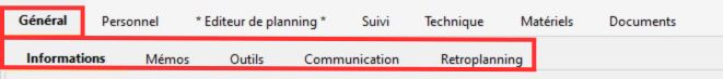 Important : l'onglet "Rétroplanning" est soumis au droit utilisateur C18 (voir le chapitre "Droits utilisateurs"). D'autres sous-onglet sont ajoutables en faisant un clic-droit sur la fenêtre (voir le chapitre "Personnaliser la fiche Spectacle").