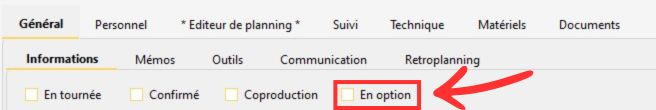 Pour afficher à l'impression le point d'interrogation indiquant une option pour un spectacle, il est nécessaire de cocher la case "Spectacle en option" dans la fiche du spectacle.