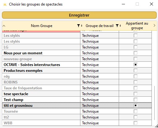 1/ Cochez la colonne "Appartient au groupe" pour modifier l'appartenance de votre spectacle / activité.