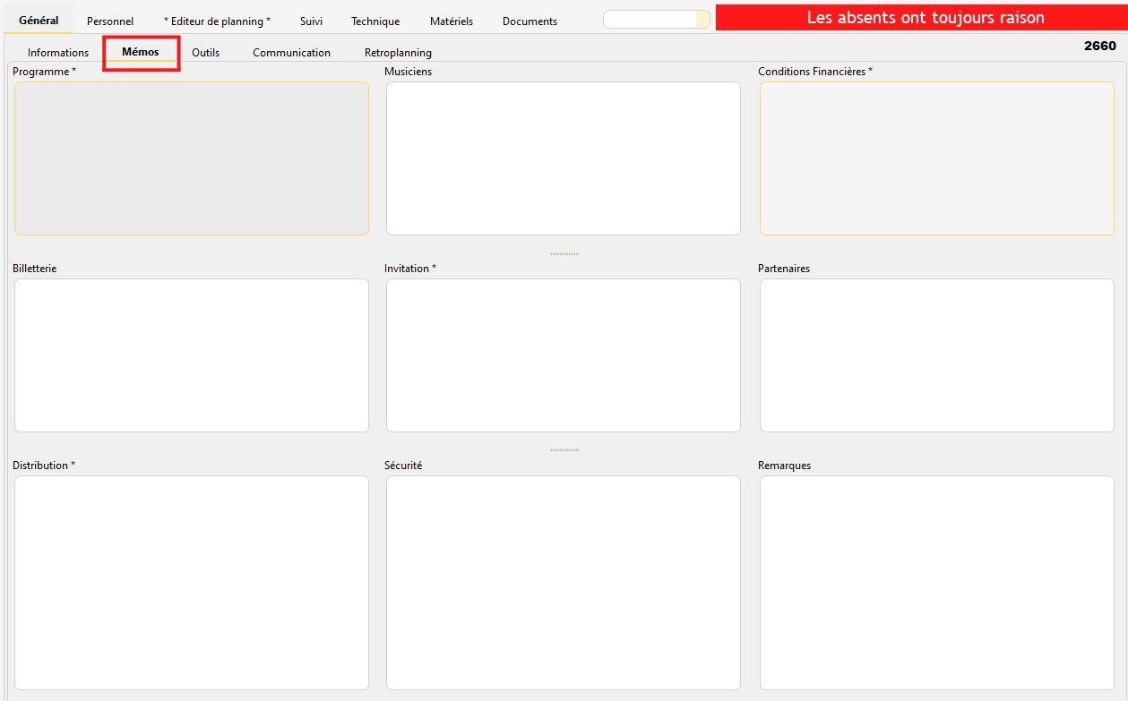 - Musiciens : Ce mémo permet d'apporter des renseignements concernant les musiciens.