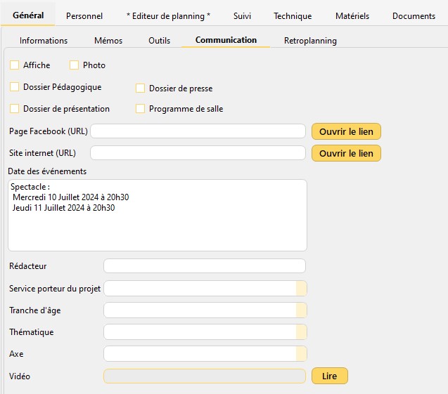 . Deux nouvelles coches "Dossier de presse" et "Programme de salle" permettent à l'utilisateur de renseigner si un dossier de presse et un programme de salle ont été transmis par l'artiste ou la compagnie.
