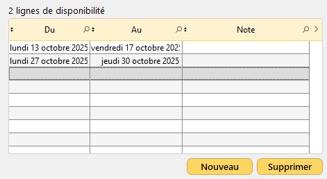 La table des disponibilités d'un spectacle se trouve dans l'onglet "Général" et dans le sous-onglet "Programmation". Elle permet au programmateur de la structure de mémoriser les disponibilités du spectacle pour sa programmation future.
