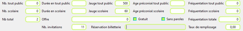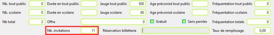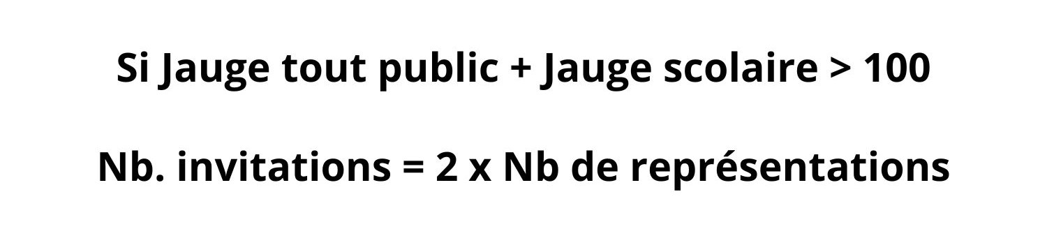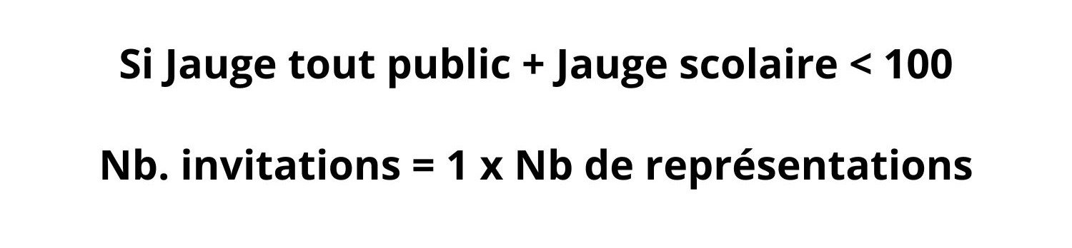 Si la somme de la "Jauge tout public" et de la "Jauge scolaire" est supérieure à 100, alors le nombre d'invitations sera égal au double du nombre de lignes de planning avec une source d'événement comme description dans la fiche Spectacle.