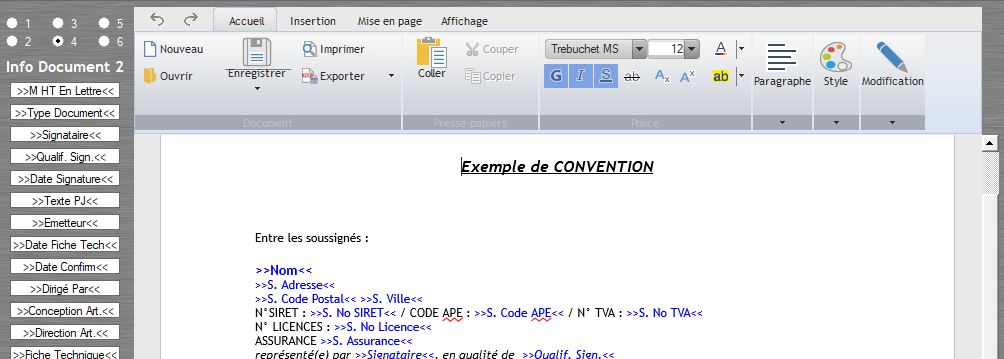 Un système de traitement de texte est disponible pour créer les modèles de contrat de cession, convention et documents. L'avantage d'utiliser ce nouveau système permet qu'une fois que les données et le modèle ont fusionné, il est encore possible de modifier le document obtenu.