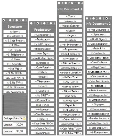 Tous les champs automatiques à insérer dans le modèle sont rangés dans 6 boutons :