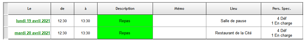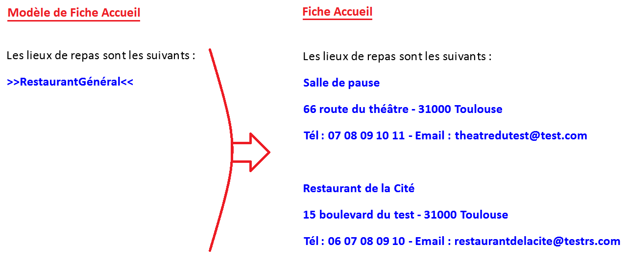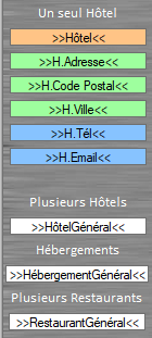 En liant la description "Repas" a un champ automatique (par exemple : ">>RestaurantGénéral<<"), les lieux de repas apparaîtront automatiquement lors de l'édition de la Fiche Accueil en s'appuyant sur le planning.
