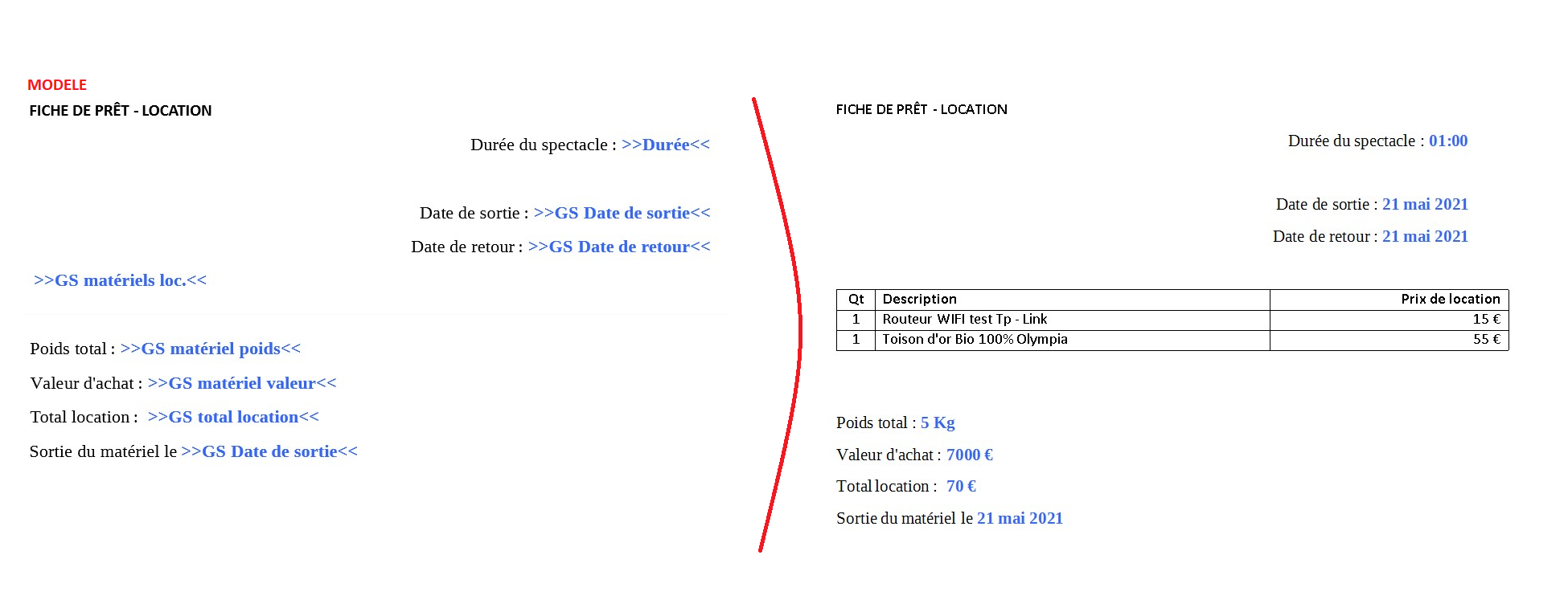 Une fiche de prêt ou de location peut être éditée depuis la fiche spectacle ou activité. A ce titre des champs automatiques spécifiques peuvent être utilisés.