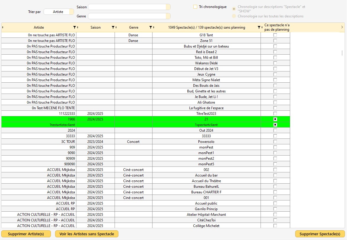 Cette fenêtre vous affiche la liste des spectacles et artistes présents dans votre base de données.