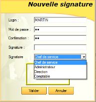 L’Éditeur de login possède 4 niveaux de signature "Chef de service", "Administrateur", "Direction" et "Comptable".