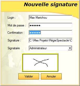 La création d'une signature électronique depuis l'éditeur de login (ainsi que le droit utilisateur A29 : Signature électronique) permettent l'utilisation des signatures électroniques des contrats de travail. Cette création nécessite le renseignement d'informations importantes dans l'éditeur de login, lors de la création d'une signature, dans l'éditeur de login de RégieSpectacle.