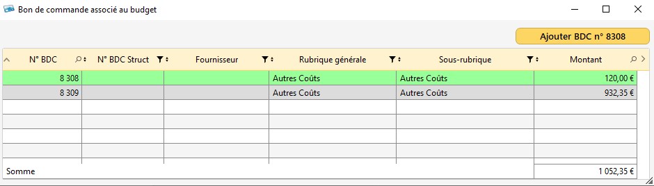 Une fenêtre affiche tous les bons de commande associés à cette sous-rubrique (celui qu'on inclut apparaît en vert)