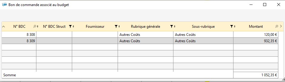 Une table apparaît avec les bons de commandes liés à cette sous-rubrique.