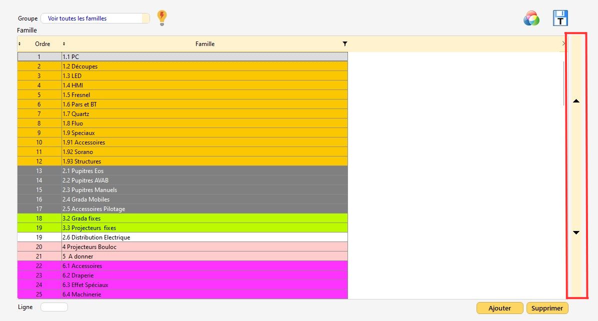 Il est possible de modifier, d'ajouter, de supprimer et de réordonner le matériel dans chacune de ces 5 familles. Il est aussi possible de créer ses propres familles et de faire passer une partie du matériel d'une famille vers une autre famille.