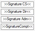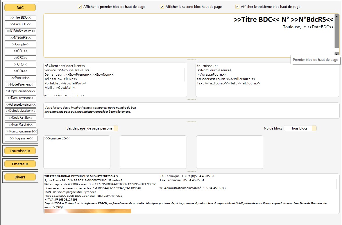 Il peut être remplacé par un bloc de bas de page Perso(nnalisable), il est possible d'intégrer jusqu'à 4 blocs. Vous pouvez les utiliser pour y intégrer les champs des différentes signatures, par exemple, que vous trouverez dans "Émetteur".