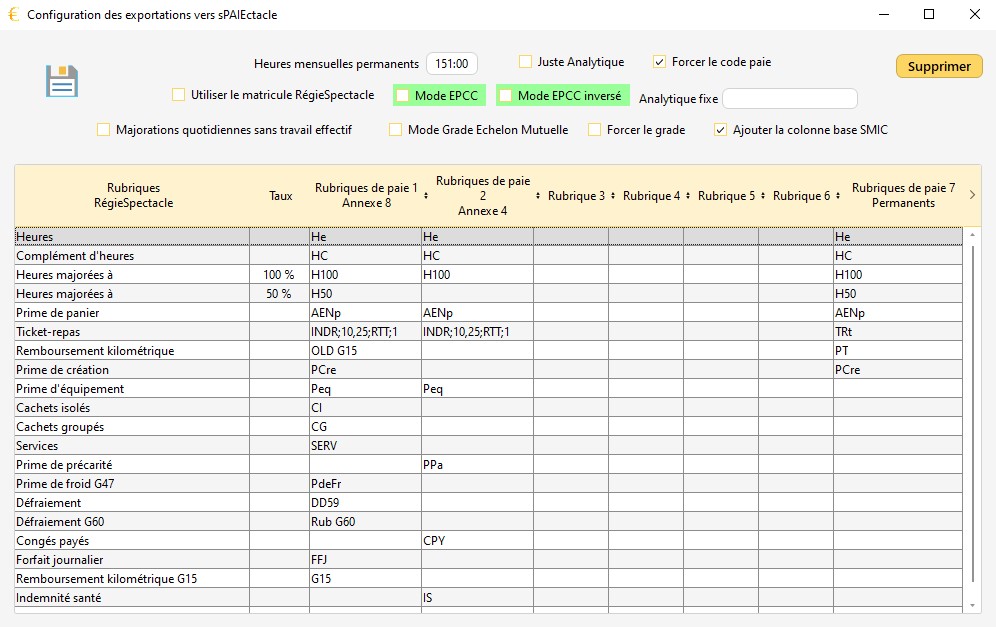 Dans la configuration des exports vers sPAIEctacle (Outils/Options/onglet 'Personnel/Contrat/Impression'), il est possible de gérer :