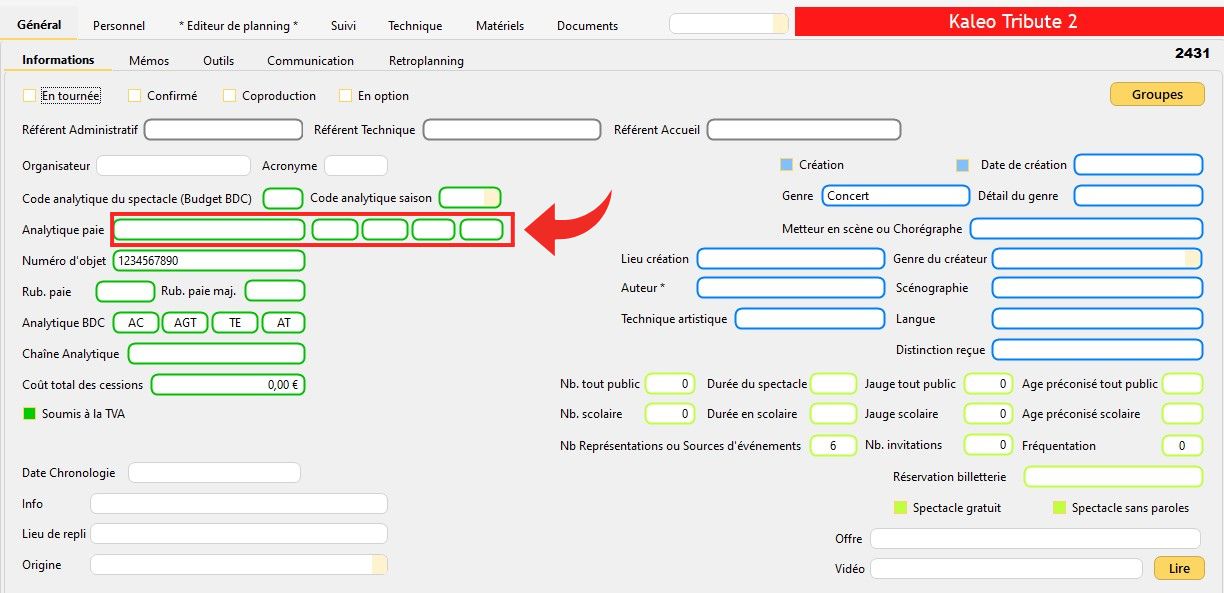 Pour ce faire, il suffit de saisir ce code dans le champ "Analytique paie" de la fiche d'un spectacle ("Fiche Spectacle détail" / onglet "Général").