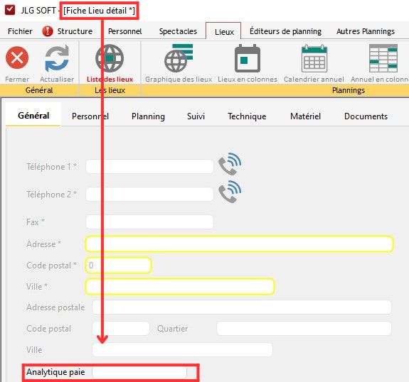1/ Allez dans la fiche détail d'un lieu, dans l'onglet Général, introduire le code analytique de la paie