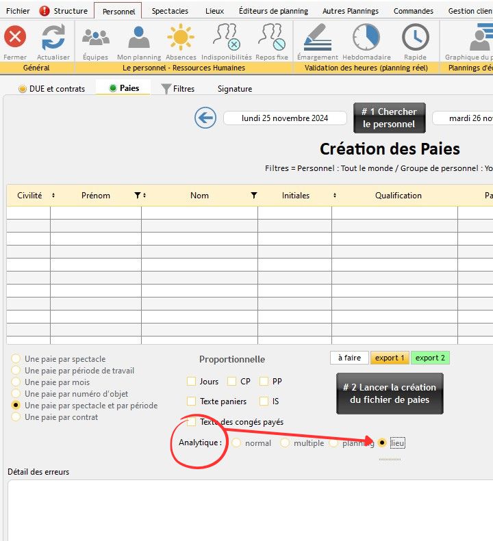 Il est possible d'exporter le code analytique du spectacle dans la paie.