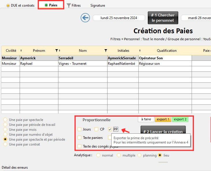 Lors de l'export de la paie pour l'annexe 4, il est possible d'exporter la prime de précarité pour les intermittents.