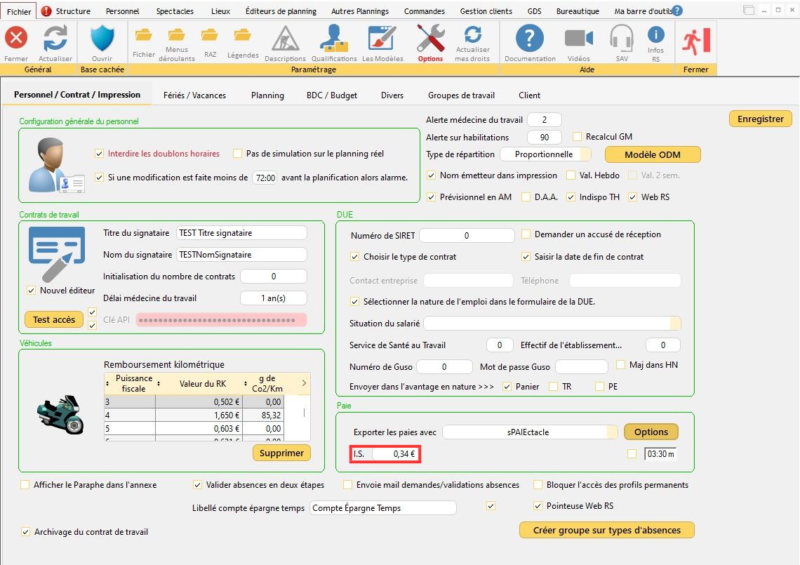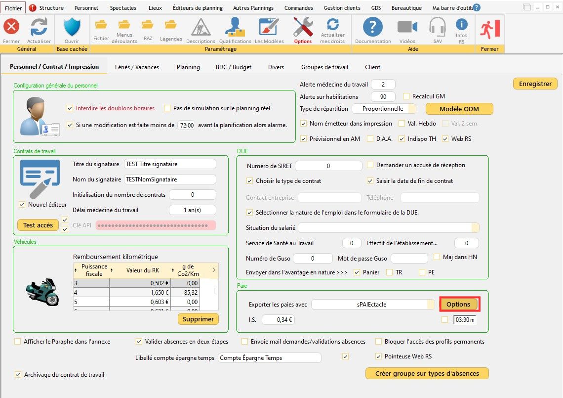 Pour ouvrir cette fenêtre, dans le menu principal de RS cliquez sur "Outils/Options/Onglet(Personnel-Contrat-Impression)/Options sPAIEctacle"
