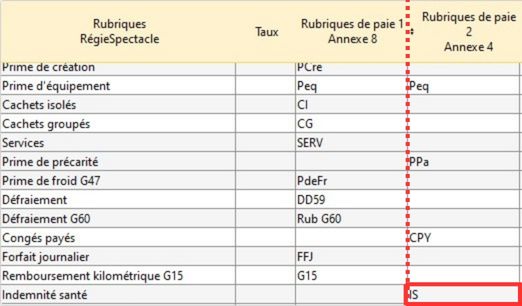 Info : "Indemnité Santé" apparait sur une nouvelle ligne de la table dans la colonne "Rubriques RégieSpectacle".
