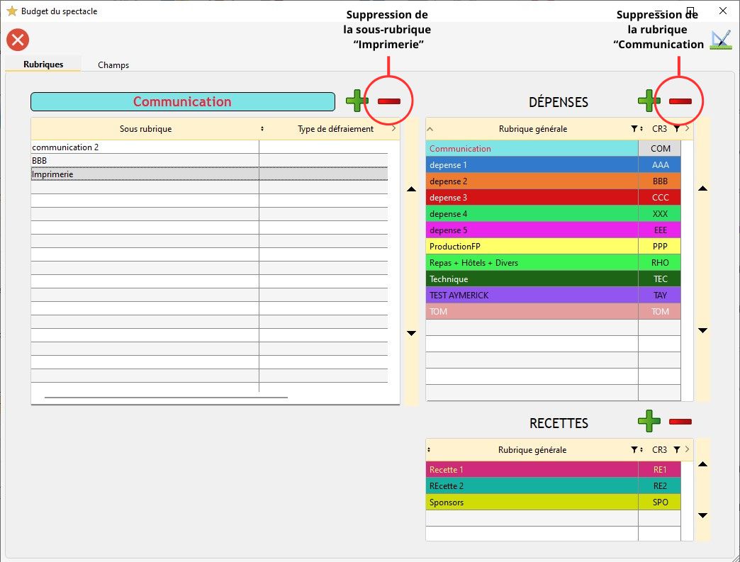 Important : Attention, si un utilisateur supprime une rubrique ou-sous rubrique dans la fenêtre de paramétrage des budgets, il écrase aussi les données concernant la rubrique ou la sous-rubrique dans les budgets des fiches spectacles et activités. Le budget est recalculé en conséquence.