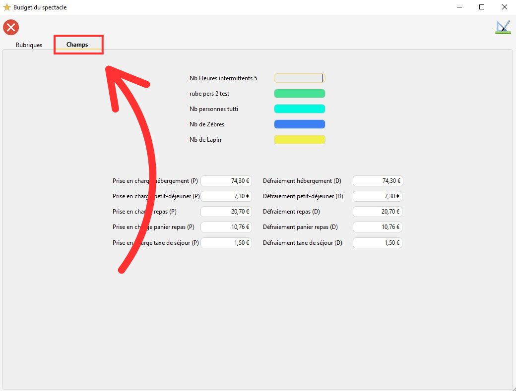 Pour personnaliser les champs du budget des spectacles, cliquez sur l'onglet "Champs".