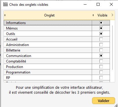Astuce : Pour une simplification de votre interface, il est conseillé de conserver un seul onglet et décocher les autres (Informations, Mémos, Outils). Vous pourrez retrouver les champs proposés en étape 2.