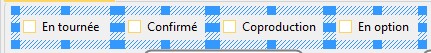 Info : Pour personnaliser votre onglet sur mesure, à vous de naviguer dans les onglets par défaut et sélectionnez ceux dont vous avez vraiment besoin. Le champ choisi sera copié et placé dans votre onglet personnalisé. Chaque thématique de champs possède un code couleur (Comptable, Billetterie, Artistique et autres). Plus tard, il vous sera possible de déplacer vos nouveaux champs dans votre onglet en étape 3.