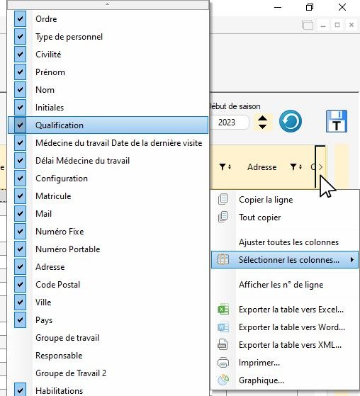 Les colonnes sont le reflet des rubriques présentes dans les fiches personnels (voir le chapitre "Création d'une fiche personnel"). Il en existe de nombreuses dont certaines sont soumis aux droits utilisateurs (voir le chapitre "Droits utilisateurs - Gestion du personnel").