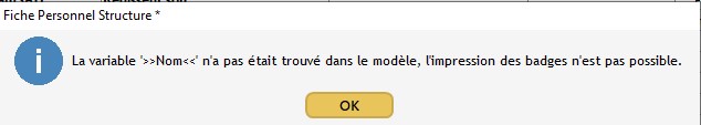 Attention : chaque badge doit obligatoirement comporter le champ automatique ">>Nom<<". Si le modèle ne comporte pas cette variable, un message d'erreur apparaîtra et l'édition des badge sera impossible.