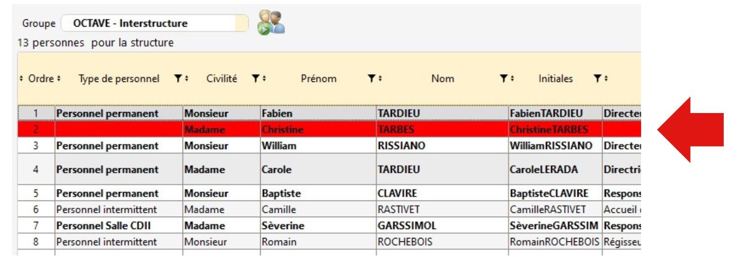 Si aucune configuration du personnel n'a été donnée à une fiche personnel lors de sa création, la ligne apparaît en rouge surlignée.