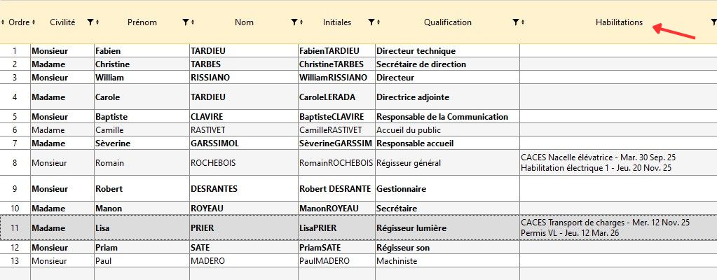 Il est possible d'afficher les habilitations du personnel dans la Liste du Personnel de la Structure.