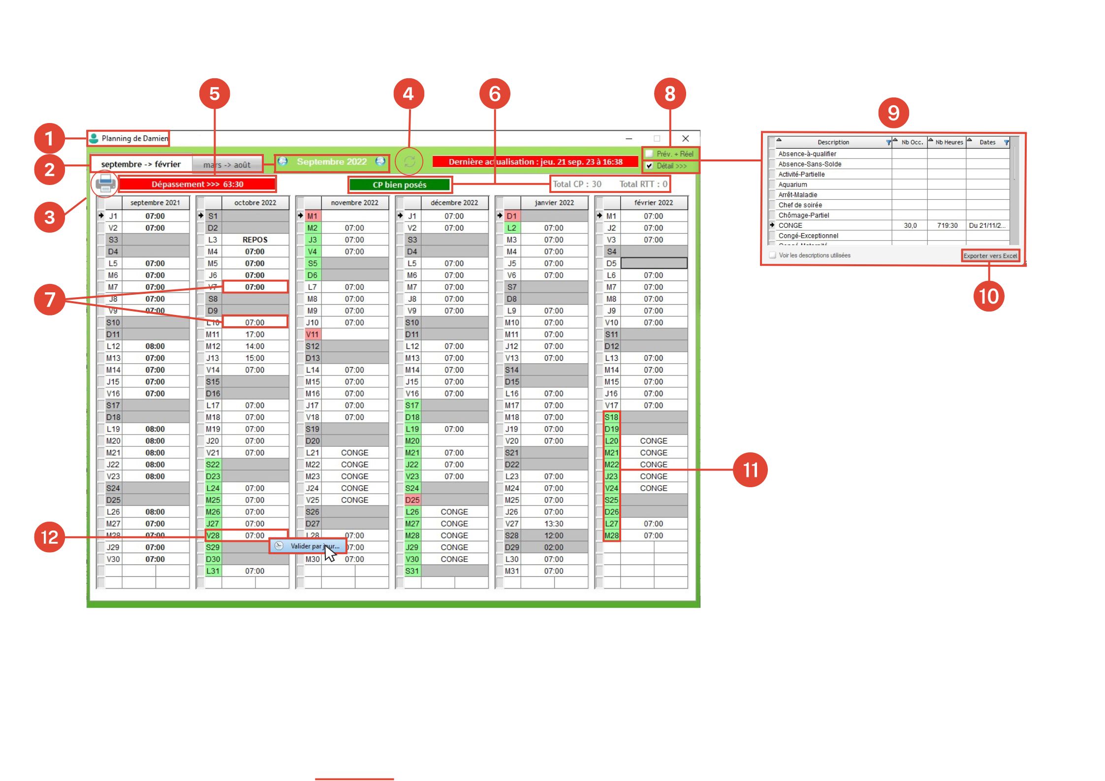 Un clic-droit sur une journée permet d'ouvrir la fenêtre de validation des heures : modifier ou valider le planning est accessible d'ici.