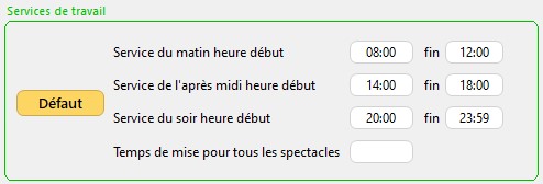 Dans l'éditeur de planning, la fonction "Créer le planning technique" permet de créer automatiquement des services de montage et démontage (voir le chapitre "Éditeur de planning"). Le temps de mise pour les spectacles se personnalisent également.