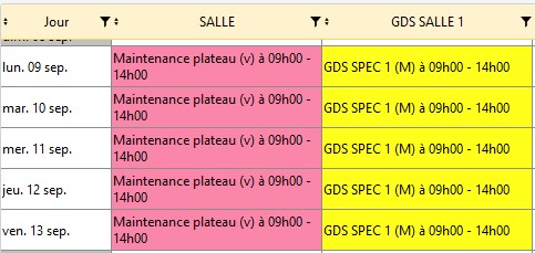Les lignes de planning qui utilisent le mot clé "Spectacle" ou une des descriptions source d'événement sont toujours visibles quelque soit le groupe de travail.