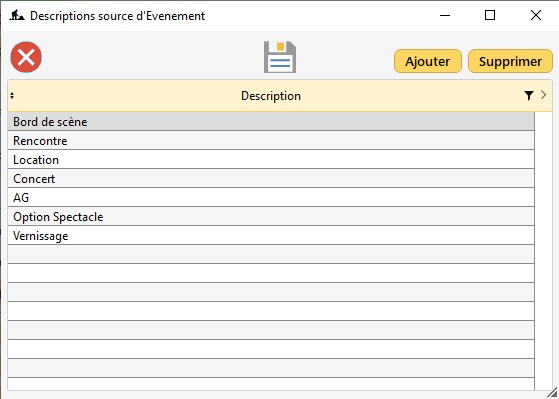 Les descriptions grisées sont celles incluses dans le logiciel, l'utilisateur ne peut ni les modifier ni les supprimer.