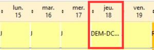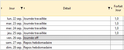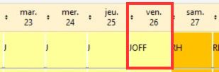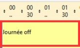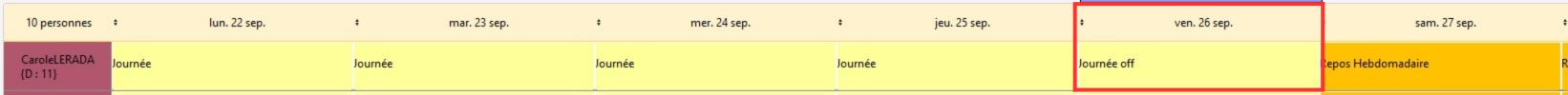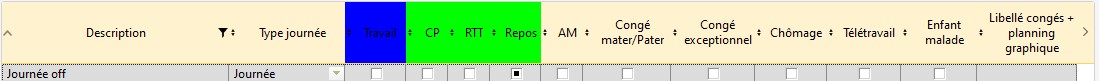 Dans cet exemple la nouvelle description cadre a été créé : elle compte comme une journée entière (1 case cochée) de repos (pas de temps de travail), son libellé est JOFF.