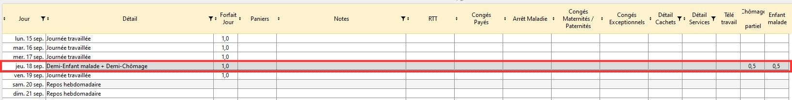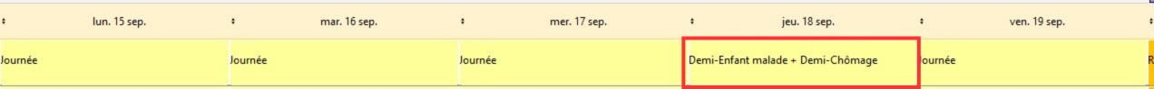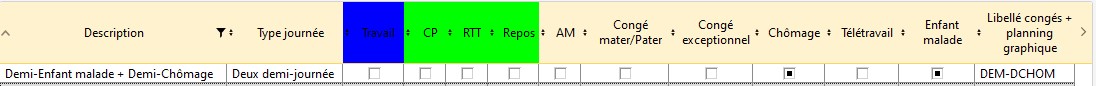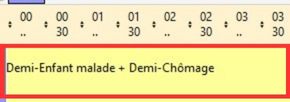Dans cet exemple la nouvelle description cadre a été créé : elle compte une demi-journée de chômage partiel et une demi-journée enfant malade (soit deux demi-journée), son libellé est DEM-DCHOM.