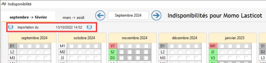 Info : La date de la dernière importation apparaît dans la fenêtre d'indisponibilités de l'intermittent. Il est possible de consulter l'historique des dernières modifications de l'utilisateur WebRS grâce aux flèches directionnelles.