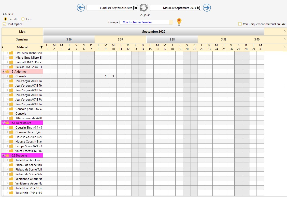 Le planning affiche jour par jour la quantité de matériel affectée sur des spectacles ou des activités dans une période sélectionnée.